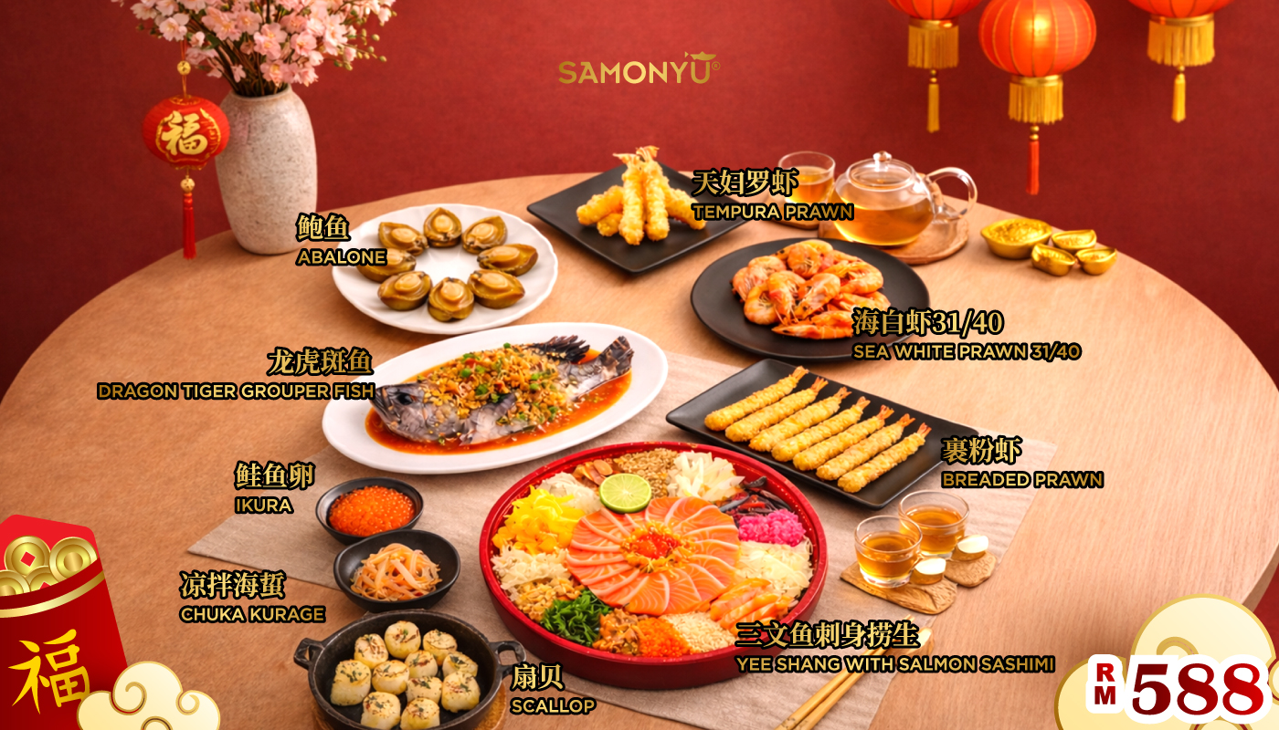 Our premium CNY package, packed with festive favourites and perfect for sharing with loved ones during reunion dinners and celebrations. This RM588 package includes : Dragon Grouper Fish, Scallop, Abalone, Sea White Prawn (31/40), Tempura Prawn, Ikura, Chuka Kurage, Breaded Prawn and The Prosperity Yee Shang with Salmon Sashimi.